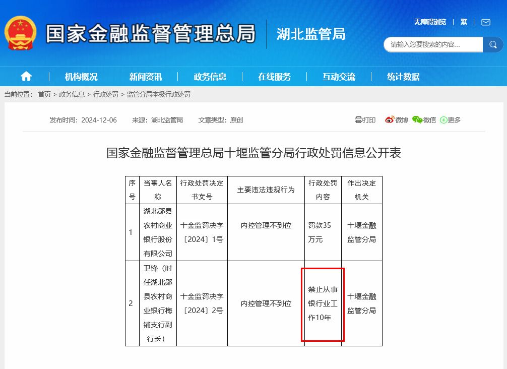 日前,国家金融监督管理总局十堰监管分局发文称,卫锋(时任湖北郧县农村商业银行梅铺支行副行长),因为内控管理不到位,被禁止从事银行业工作10年。湖北郧县农村商业银行股份有限公司也因内控管理不到位被罚款35万元。
